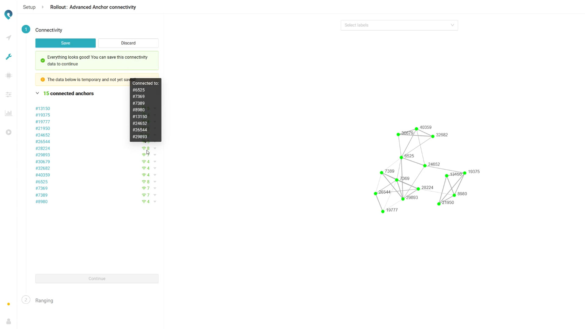 Wenn Sie einen Konnektivitätstest ausführen, erhalten Sie eine Karte, die zeigt, wie alle Anchors in Ihrem Setup miteinander verbunden sind. Wenn Sie mit der Maus über einen Anchor fahren, werden die mit diesem Anchor verbundenen Anchors angezeigt. Die Ergebnisse können ganz einfach für spätere Referenzen gespeichert werden.