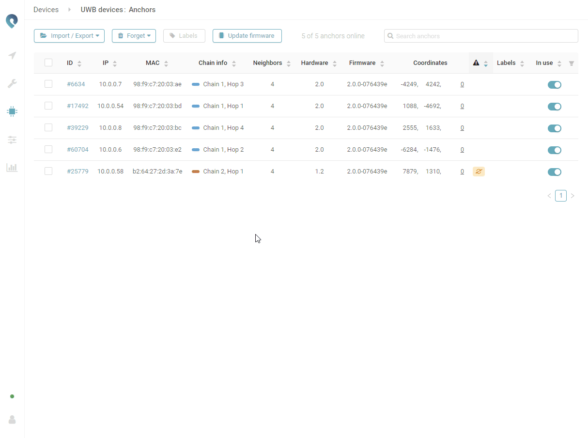 La aplicación web ahora te notifica automáticamente sobre nuevas actualizaciones de firmware para tus Pozyx Anchors. Solo tienes que ir a Devices > Anchors para actualizar tus Anchors. Si utilizas la aplicación en la nube, puedes seleccionar entre las últimas versiones firmadas de Pozyx. Para instalaciones locales, puedes cargar archivos de firmware.